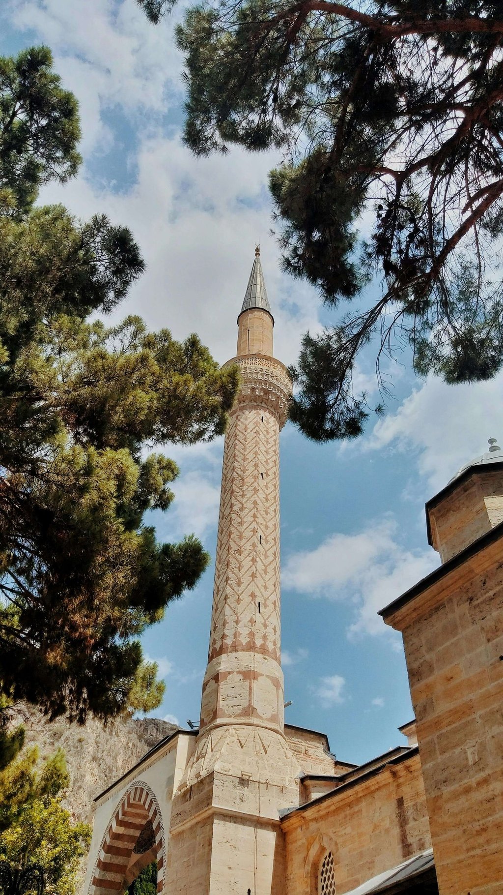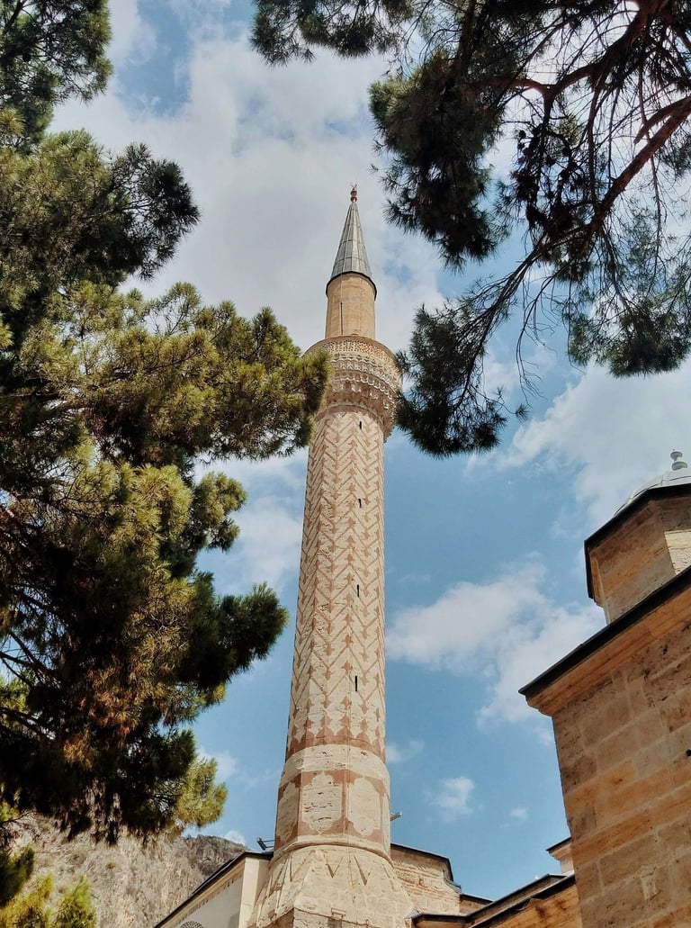 Burmalı Minare Camisi: Dere Mahallesi'nde yer alan cami Selçuklu Sultanı II. Gıyaseddin Keyhüsrev zamanında Vezir Necmeddin Ferruh Bey kardeşi Haznedar Yusuf tarafından yaptırılmıştır. 1590'da deprem ile, 1602'de yangın sonunda hasar gören bina birçok onarım ve restorasyon sonucu orijinal görünümünü kaybetmiştir. Kıble duvarlarına dikey uzanan üç nefli bir plana sahiptir. Ahşap minberi kitabeli olup Mahkeme Camii olarak da bilinmektedir.