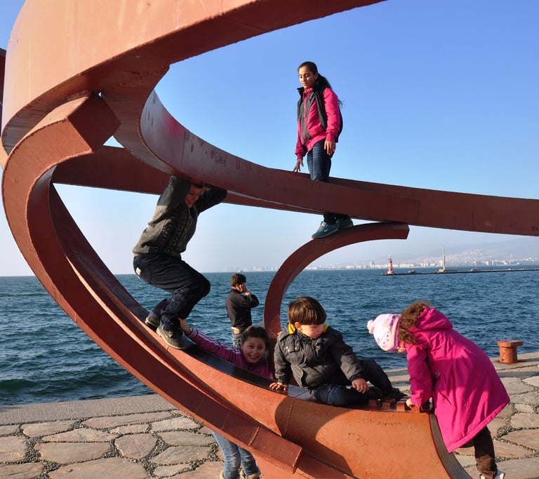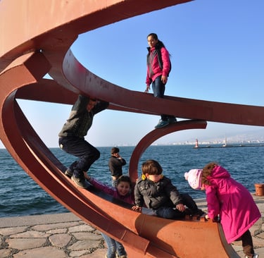Evet, yürümeyi yeni beceren bebelerin oyun parkı, kaydırak gibi bellemeleri ve tırmanmak için huysuzlanmaları benim için heykelin kullanılması demek oluyor. Bu anlamda İzmir’de başka bir heykel yok gibi sanki. Bir de Okay Temiz o heykeli bir çalsa çok iyi olur derim. Bir gün teklif edeceğim.